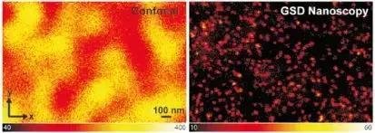由于GSD是將粒子激發(fā)到高能自發(fā)輻射級(jí),與STED強(qiáng)制讓粒子做受激輻射而不是自發(fā)輻射相比,其所需能量可能會(huì)小很多。2010年,Hell課題組利用鉆石中氮空穴中心實(shí)現(xiàn)光切換,實(shí)現(xiàn)了12 nm分辨率的GSD成像結(jié)果,其GSD所采用光強(qiáng)僅為STED的千分之—。