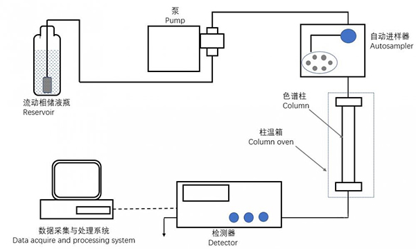 液相色譜的構造分為五大部分:進樣部分(手動進樣或自動進樣),驅動液體流動的色譜泵,主導分離的色譜柱(有些配柱溫箱),檢測器、數據采集和分析系統。