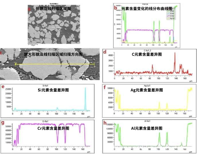 電子束沿著一條分析線進行掃描時,可以獲得元素含量變化的線分布曲線。通過與試樣形貌相結(jié)合分析,可以直觀地獲取元素在不同相或區(qū)域內(nèi)的分布情況。