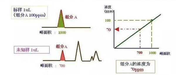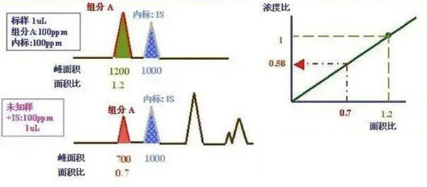 組分A 的濃度為未知樣中的內(nèi)標(biāo)濃度:100ppm X 濃度比0.58 = 58ppm